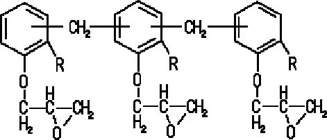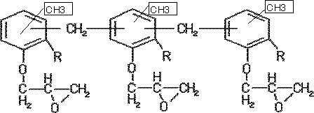 1) ビスフェノールA型エポキシ ![]() 特徴 は @ 反応性エポキシ環(3員環)、A可とう性・耐薬品性エーテル結合(-O-)、B 強靭性・剛性・高温物性(6員環のベンゼン環)、C接着性 OH基 です。 これによって 硬化収縮が少なく、強靭で耐熱性に優れ、耐薬品性も良好であること。 BAエポキシの合成は ビスフェノールA と エピクロルヒドリン の反応によります。 ![]() 2) ビスフェノールF型エポキシ BA型エポキシ樹脂より低粘度、硬化物性はほぼ同等であるが耐熱性が 若干低く、耐薬品性が若干良い。 ![]() 3) ビスフェノールAD型エポキシ BA型より低粘度で非結晶性 ![]() 4) フェノールノボラック型エポキシ フェノール と ホルムアルデヒドから フェノールノボラックを合成し、これにエピクロルヒドリン と反応させて得る。 ![]() 5) クレゾールノボラック型エポキシ ![]() フェノールの代わりにo−クレゾール,重合度が増大するほど高官能になり、 耐熱性が向上する。 硬化剤
